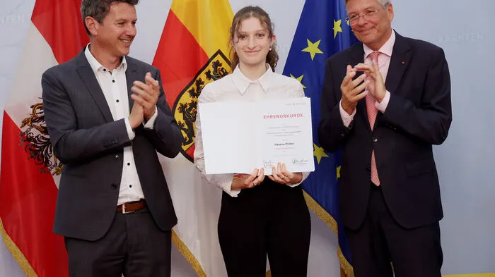 Landesrat Daniel Fellner und Landeshauptmann Peter Kaiser gratulierten Bundessiegerin Helena Pirker