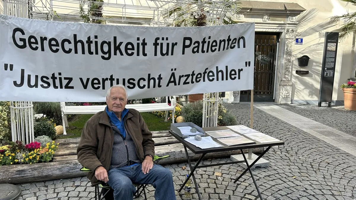 Fritz Pirker aus Gmünd demonstriert, im Rahmen einer Ein-Mann-Demo vor dem Spittaler Rathaus, für die Aufklärung von "Ärztefehlern", mit deren Nachwirkungen er seit Jahren zu kämpfen hat.