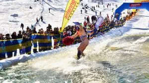 Waterslide Contest Ein eiskalter Ritt über das Wasser auf dem Nassfeld 65 waghalsige Teilnehmerinnen und Teilnehmer gingen beim "Waterslide Contest" auf der Sonnenalpe an den Start. Beim Wellenritt über das Wasserbecken wurde auch viel nackte Haut gezeigt. Waterslide Contest