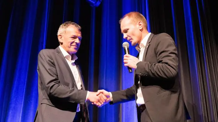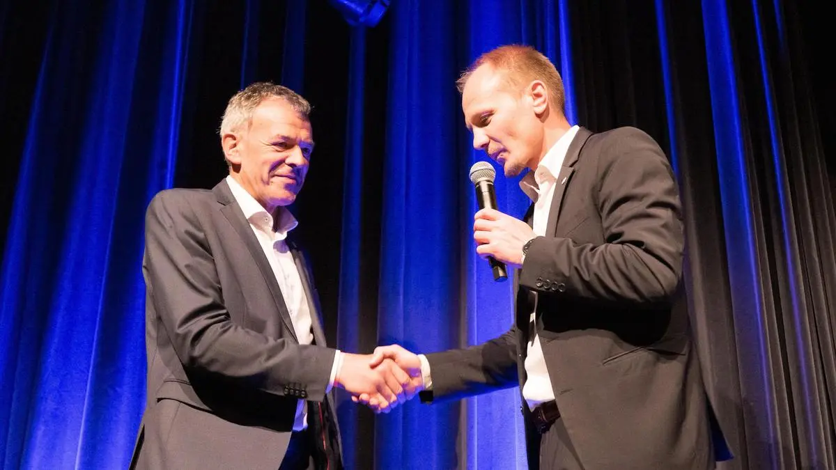 Der frisch gewählte Bürgermeister Johannes Anzengruber (Ja - Jetzt Innsbruck) mit seinem Vorgänger Georg Willi (Grüne) rechts im Hintergrund.