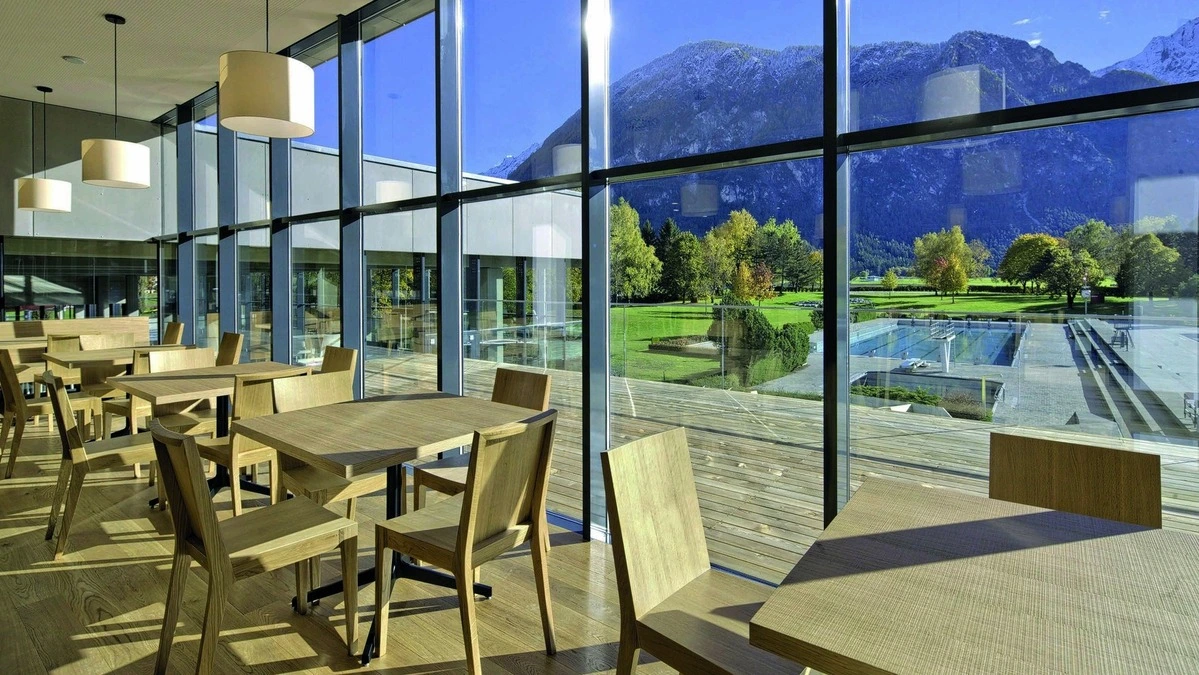 Restaurant mit Blick aufs Bad und die Dolomiten: Hierfür werden neue Pächter gesucht