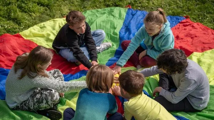 Kinder in einer Rainbows-Gruppe sitzen auf einem bunten Regenbogentuch | In Rainbows-Gruppen finden Kinder und Jugendliche Angebote nach einer Trennung oder Scheidung