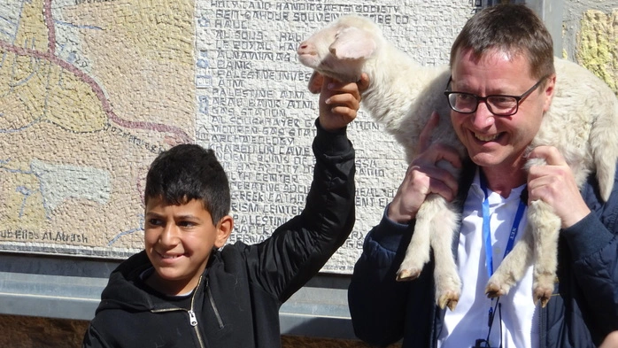 Franz Troyer mit einem Bub und einem Lamm