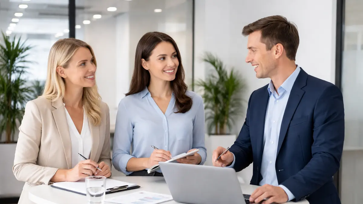 Zwei Frauen werden von einem Mann an einem Stehtisch beraten