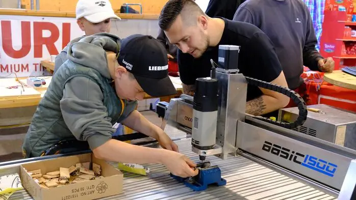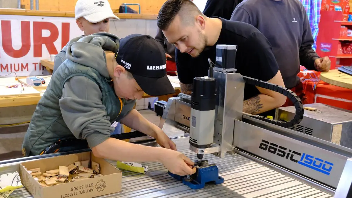 Ein Schüler probiert sich beim Osttiroler Berufsfestival am Stand der Firma Theurl an der Holzbearbeitung