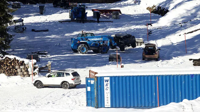 In Osttirol ist man gerade damit beschäftigt, Kulissen aufzubauen. Etliche Flugzeugteile, ein lädierter Land Rover und eine etwa eineinhalb Meter hohe Schanze werden mit einem Kran von einem Fleck zum anderen gehoben.