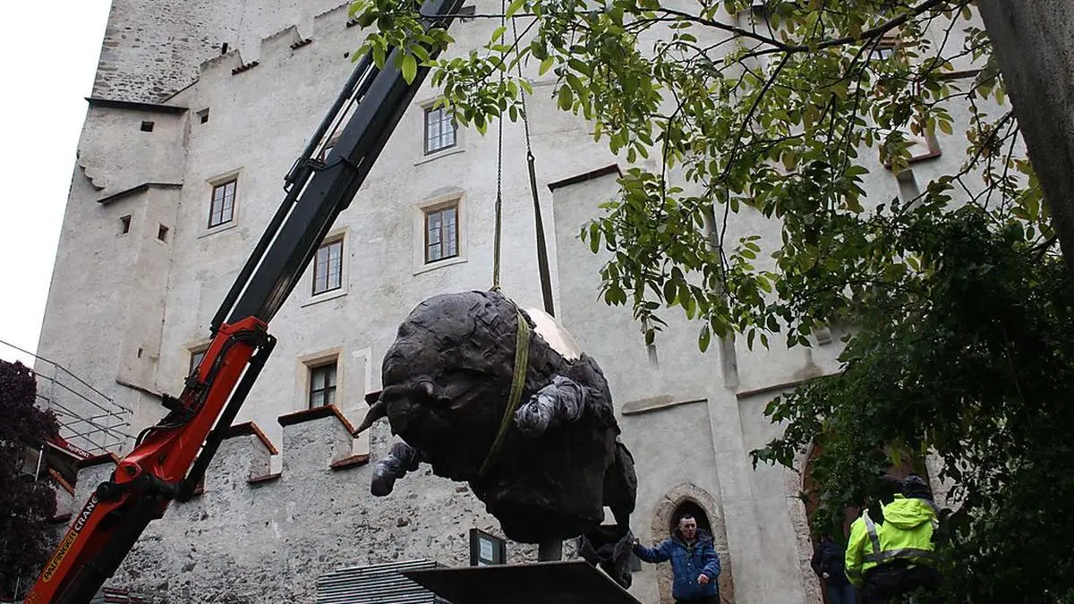Ab 22. Mai läuft die Ausstellung "Figur und Raum" auf Schloss Bruck. Freitagmittag wurde der vom Künstler Jos Pirkner gefertigte 1,5 Tonnen schwere Bulle auf der Brüstung aufgesetzt.