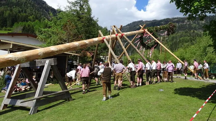 Kraft, Disziplin und Koordination war das Erfolgsgeheimnis beim händischen Maibaum-Aufstellen in Altdebant