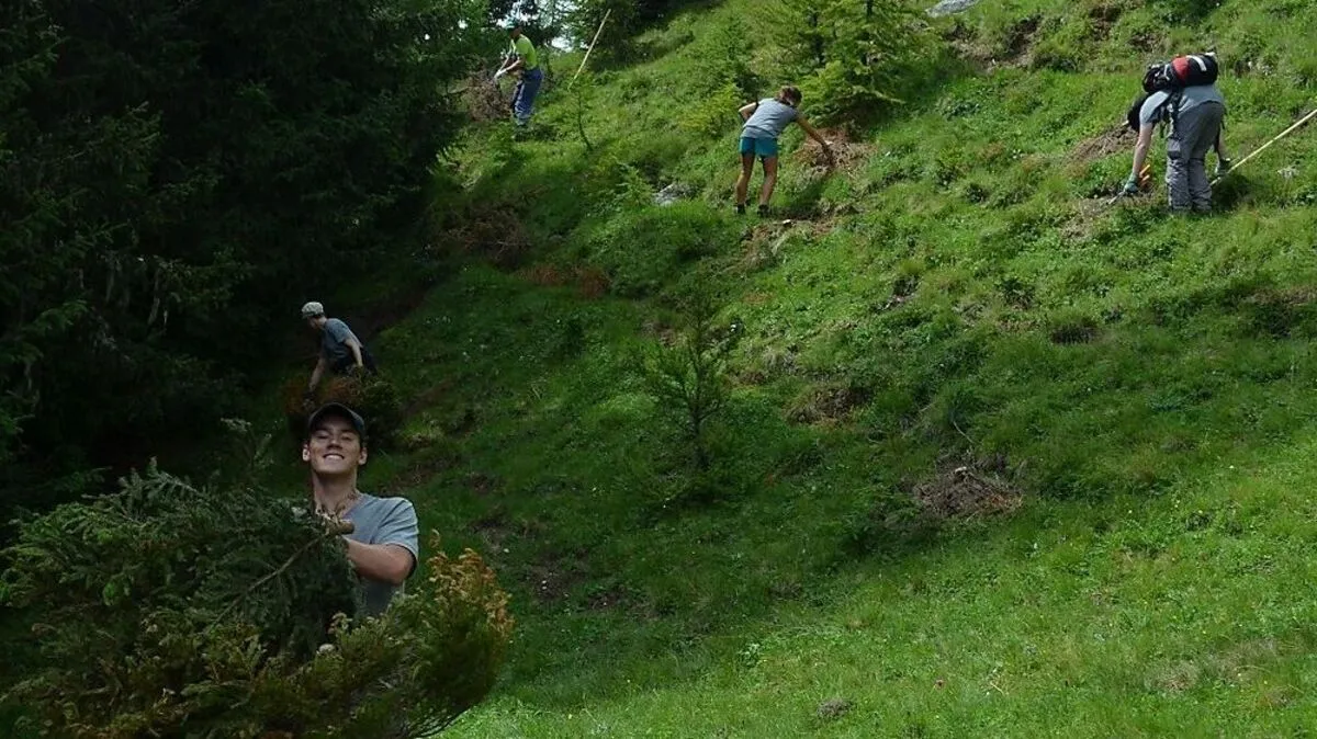 Diese Woche arbeiten 12 junge Menschen auf der Großpreimbergeralm in Osttirol. Sie entbuschen und pflegen Almwiesen - und zwar unentgeltlich.
