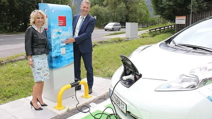 Elisabeth Blanik und Tiwag-Vorstandsvorsitzender Erich Entstrasser freuen sich über die E-Tankstelle