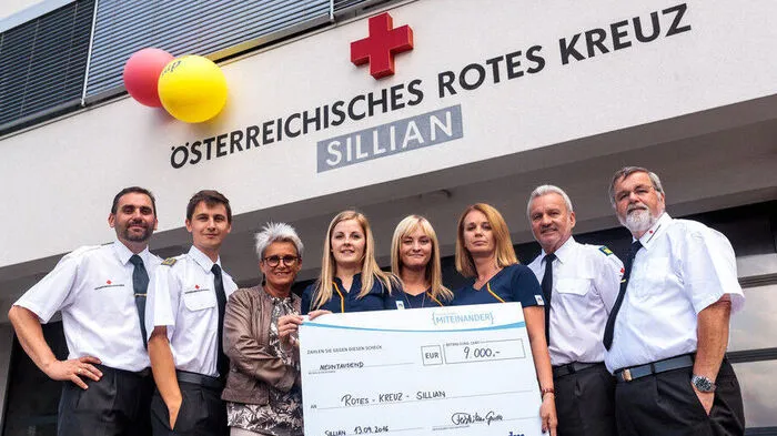 Marcus Glahn, Stephan Hofmann (beide Rotes Kreuz), Gerda Feistritzer, Alexandra Tinkl, Julia Müller, Karin Haslinger (alle dm) mit Egon Kleinlercher und Georg Glahn bei der Übergabe