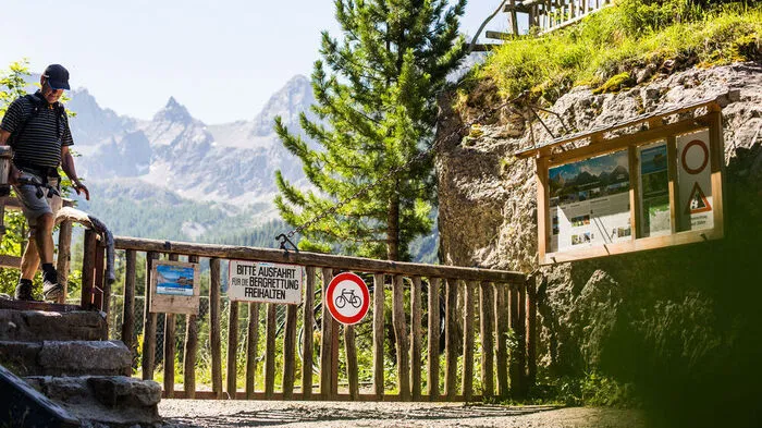 Verbotsschild für Radfahrer bei Dolomitenhütte sorgt für Diskussionen. Eine Radtour zur Karlsbader Hütte ist offiziell nicht erlaubt. Was steckt hinter der neuen Tafel?