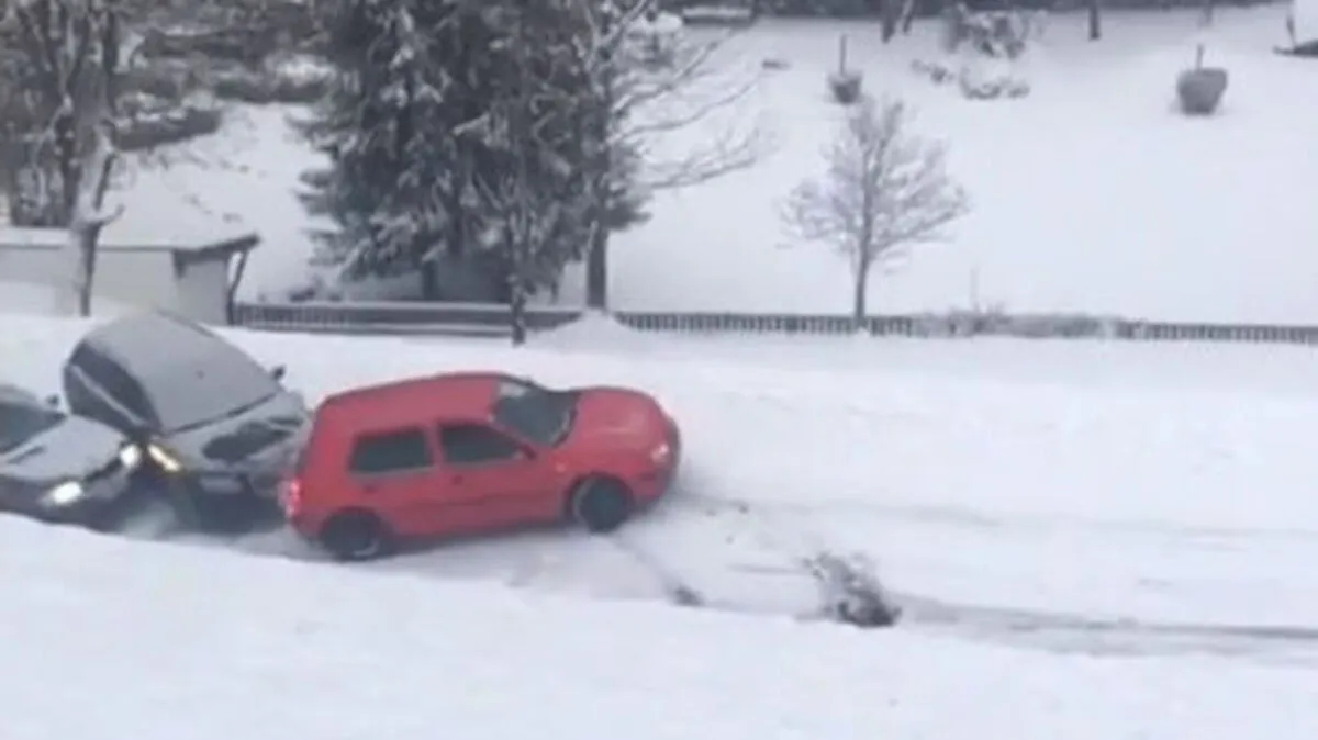 Ein Auto rutscht auf der glatten Fahrbahn ab - und kracht in ein anderes Auto. Das Video davon wird derzeit via WhatsApp verbreitet.
