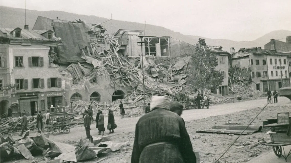 „Union Jack“ am Lienzer Rathaus. Es folgten Entnazifizierung und Ernährungssicherung.
