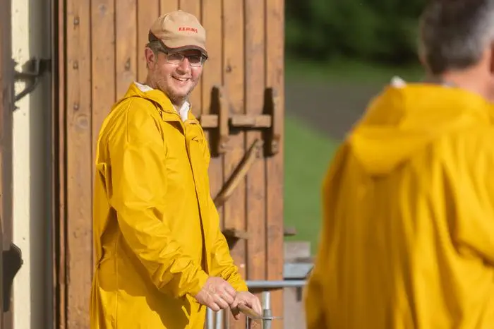 Bevor es losgeht, wird ein langer schmaler Kanal mit Wasser gefüllt. Wer jetzt allerdings denkt, die Schafe dürfen gleich in einem Schaumbad, das nach frischen Rosen riecht, baden, der irrt. Eher riecht es etwas unangenehm. Denn das Wasser muss mit dem Badezusatz Sebacil, der aus öffentlichen Mitteln zur Verfügung gestellt wird, gemischt werden. Dann ist es auch schon soweit: Thomas Zwischenberger und sein Vater Jakob schmeißen sich für den Badetag extra in Schale. Genauer gesagt streifen sie gelbe Gummistiefel und einen gelben Anzug über – wasserfest versteht sich. Nur wenige Minuten später wird auch uns klar, warum. Schon beim ersten Schaf, das in das Becken springt, bekommen wir – trotz der Vorwarnung „Achtung“, eine unfreiwillige Dusche verpasst – und zwar von Kopf bis Fuß.