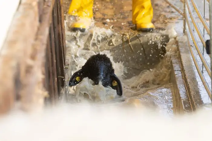 Und es geht feucht-fröhlich weiter. Nach der Reihe werden die Schafe durch den mit Wasser gefüllten Kanal geschickt. Besonders die Lämmer sind etwas zögerlich. Sie brauchen deshalb einen kleinen Schubs und auch Hilfe, um den Kanal zu durchschwimmen. Wichtig dabei sei, dass die wolligen Vierbeiner auch mit dem Kopf kurz unter Wasser sind. Manche scheinen es eilig zu haben, die Prozedur hinter sich zu bringen, andere schwimmen mutig bis ans Ende des Beckens. Und für einen kurzen Moment haben auch wir die nassen Schuhe und Socken vergessen, bis ein Schaf direkt neben uns das Wasser von sich abschüttelt und Hunderte Tropfen in alle Richtungen durch die Luft wirbelt. Nach circa einer halben Stunde ist das Spektakel schon wieder vorbei.