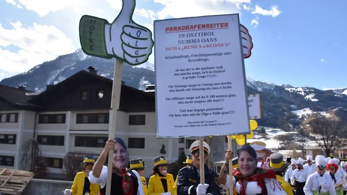 In Matrei hat man es sich erspart – das Gscher mit der Behörde. Der Faschingsumzug führt über die Gemeindestraße. So hatte das Narrentreiben am Sonntag seinen freien Lauf. Doch: Sie litten mit, die Matreier mit den Sillianern. Die müssen am Dienstag auf die Gemeindestraße – und das schmerzt. In Matrei zeigte man sich solidarisch, mit den Narren im Oberland. Und es ging nicht ab, ohne Seitenhiebe: "Paragrafenreiter in Osttirol Numma Oans isch a 'Rund's a Kloan's, Klaubauftage, Faschingsumzüge oder Kranzltoge, ob ma des in die nächsten Joah nou mochn meg, isch in Osttirol a gröaße Froge!!! Die Sillianer megn af da B100 nemma gian, oba sischt megnse olls tian'." Was in Matrei seit der Gemeindeversammlung am Dienstag nicht mehr der Fall sei. Gegen das Vorgehen der Behörde "tent viel protestian. Ob hetz miss mit da Olga a Bulle gian." Weil die Behörde so streng ist "temm ma tief trauern! Vereine von Sillian bis in die Hohen Tauern."