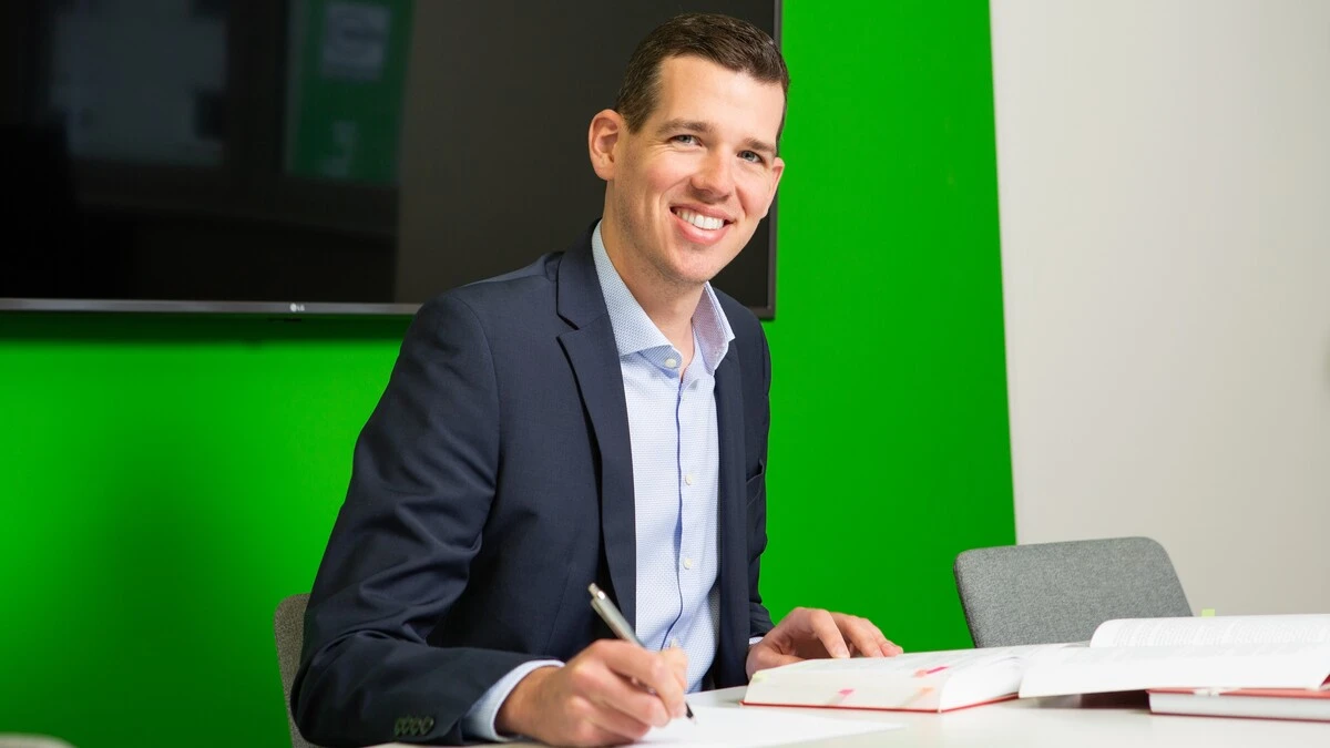 Eine Frau, geschäftlich gekleidet, sitzt an ihrem Schreibtisch und lächelt in die Kamera.