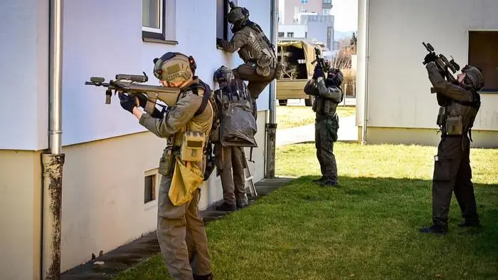 Militärhubschrauber, Fallschirmspringer und Bodentruppen in St. Veit