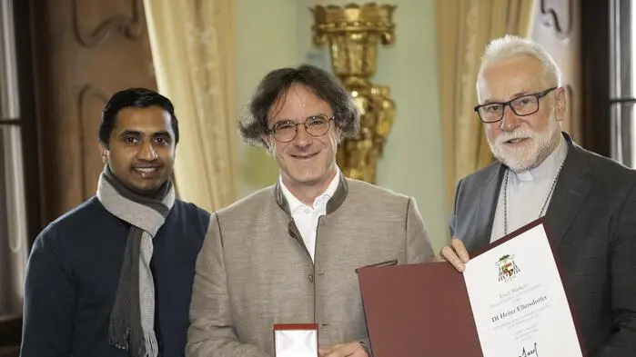 Ein aus Indien stammender Pfarrer, ein Herr mit längeren Haaren und der Bischof lachen in die Kamera. Der Bischof hält eine Urkunde und der Mann in der Mitte eine Medaille in der Hand. | Stadtpfarrer Jinu Joseph Mangalath, Heinz Ellersdorfer und Bischof Josef Marketz