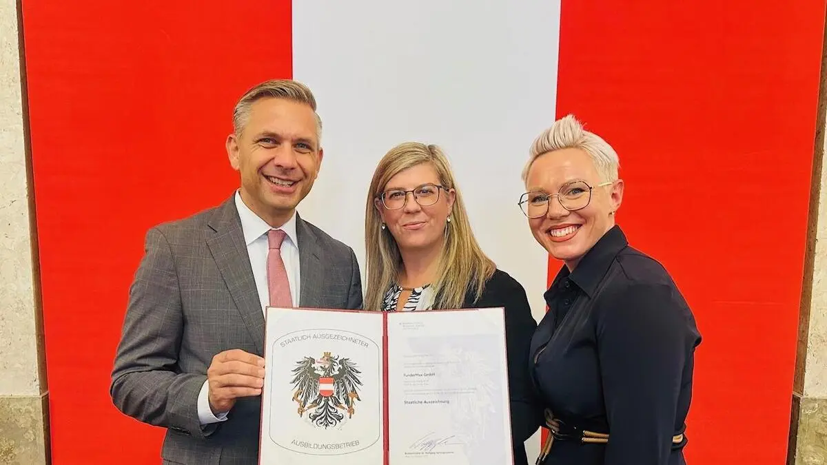 Zwei Frauen und ein Mann lachen in die Kamera. Sie halten gemeinsam eine Urkunde in den Händen. | Von links: Bundesminister Wolfgang Hattmannsdorfer, Martina Simma (Director Human Resources Fundermax) und Patricia Tötzel (Apprenticeship Management & Recruiting Fundermax)