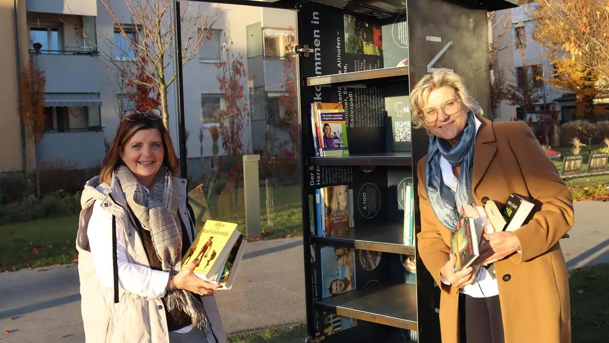 Vizebürgermeisterin Doris Hofstätter (links) mit Madeleine Müller, die den Bücherschrank betreut