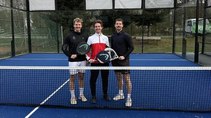 Drei Männer stehen auf einem Padeltennis-Platz, sie halten jeweils einen Schläger in der Hand.