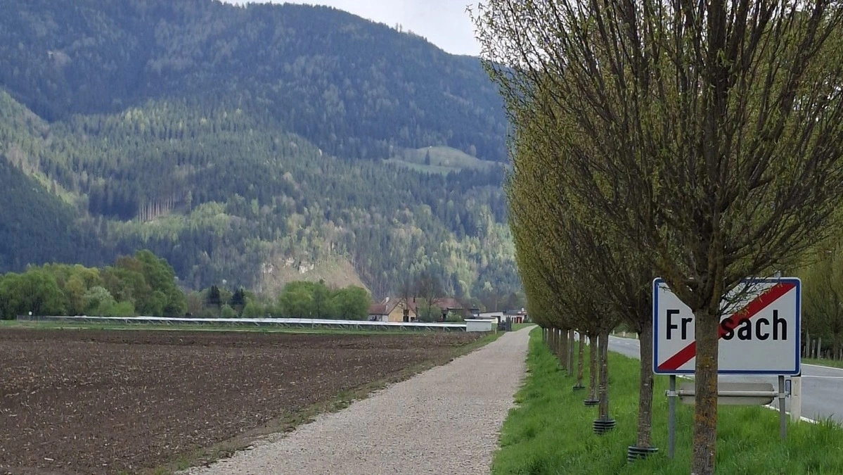 Ein Schotterweg , der an einer Landesstraße vorbeiführt, das Ortsschild „Friesach Ende“ ist zu sehen.