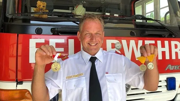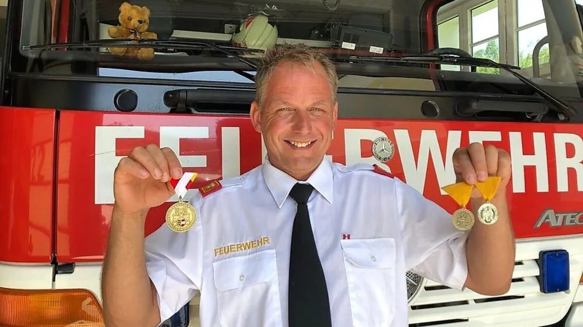 Bezirksfeuerwehrchef Friedrich Monai mit den Medaillen, die verliehen werden