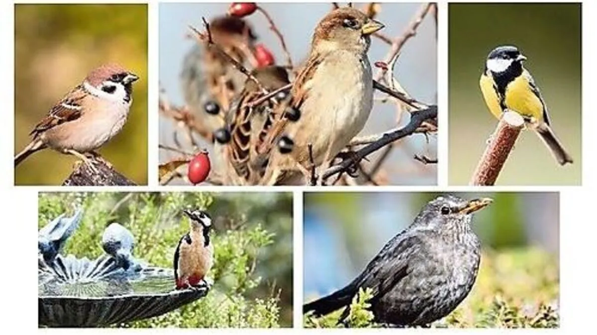 Von links: Feldsperling, Haussperling, Kohlmeise, Buntspecht und Amsel
