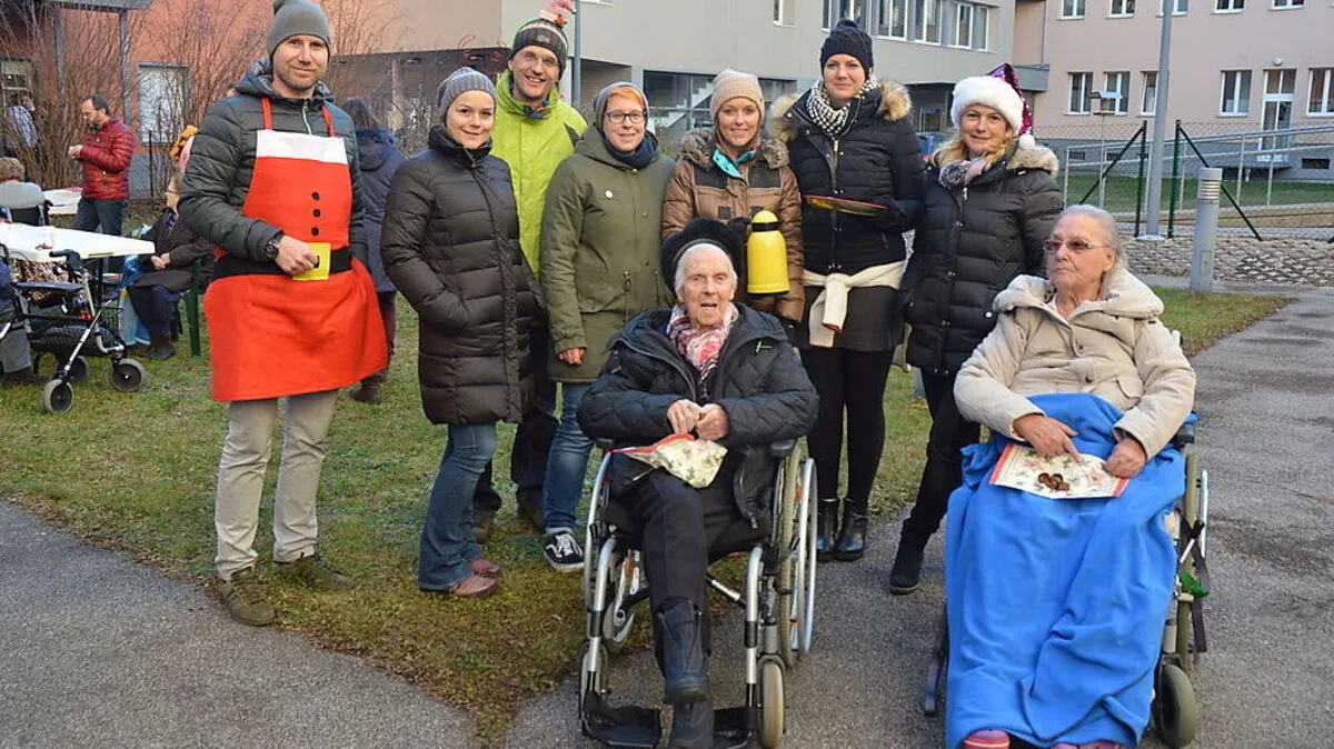 Es ist ein strahlend blauer Adventnachmittag im Garten des Altenheims Haus Martha der Caritas in Klagenfurt. Es sind Bänke und Tische aufgestellt und ein Stand, an dem Punsch, Tee gekocht und Maroni gebraten werden. In der Mitte steht eine wärmende Feuerschale.