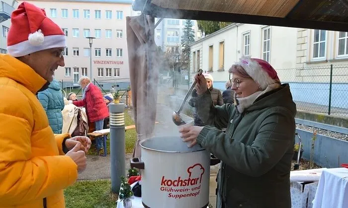Tische und Bänke sind aufgestellt und im kleinen Zelt schenkt das Team des Unternehmens Punsch aus und brät Maroni – natürlich im „Airfryer“, der in Klagenfurt entwickelt wurde. Die werden zum Anwärmen den alten Menschen ausgeteilt. Hier und da ergibt sich ein Gespräch und ein gemeinsames Lachen. Die Feuerschale zieht immer wieder zum Aufwärmen an und die Decken wärmen die sitzenden Gäste.