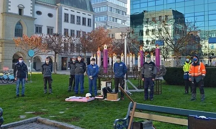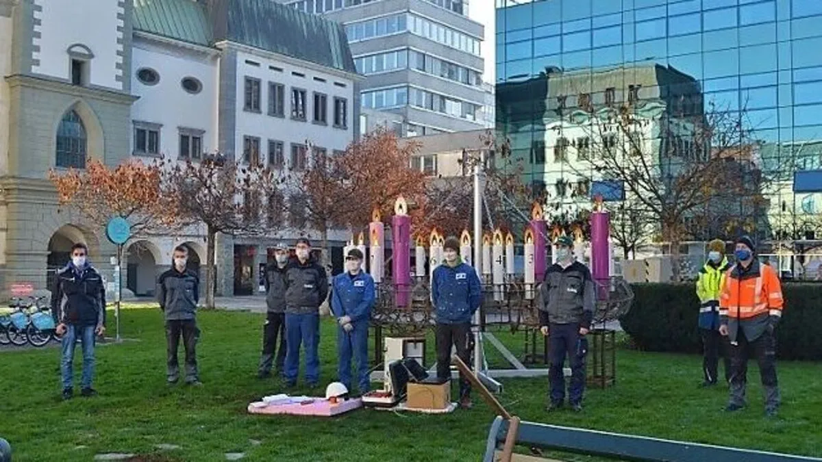 In kleinen Teams, mit Maske, Abstand und mit ganz viel Freude haben Lehrlingen aus dem 1. und 4. Lehrjahr unter der bewährten Anleitung von Ausbilder Markus Pogoriutschnig den vier Meter großen Korpus des Adventkranzes mit den 24 plus 4 Kerzen zusammengebaut und ans Stromnetz angeschlossen. Die jungen Herren, die heuer mitwirken dürfen, sind Michael, Mike, Pascal, Fabian, Florian und Miguel. Sie werden im Elektro- bzw. Metallbereich ausgebildet.