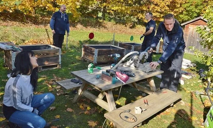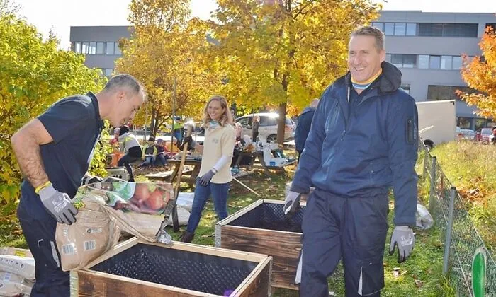 An diesem spätherbstlichen Tag sind acht Mitarbeiterinnen und Mitarbeiter der Stadtwerke Klagenfurt Gruppe im Arbeitseinsatz und bauen vier Hochbeete für die Kinder. Aus Paletten, Brettern, Folie und unzähligen Erdsäcken entstehen hochprofessionelle kleine Gärten.