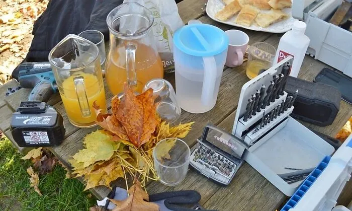 Am Tisch unter dem großen Baum stapeln sich Schrauben, Bohrmaschinen und viele andere Werkzeuge, aber auch Apfelstrudel und Croissants beschreiben das Arbeitsumgebung.
