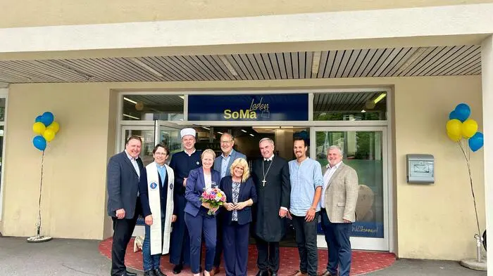 Bei der Eröffnung anwesend: v.li.n.re.: Stadtrat Erwin Baumann (FPÖ), Stadthauptpfarrer Richard Pirker, Imam Hasudin Atanović, Geschäftsführerin Theres Leber, WKO-Bezirksstellenleiter Bernhard Plasounig, Vize-Bürgermeisterin Gerda Sandriesser (SPÖ), Superintendent Manfred Sauer, Stadtrat Sascha Jabali (Erde) und SoMa-Obmann Klaus Lesjak