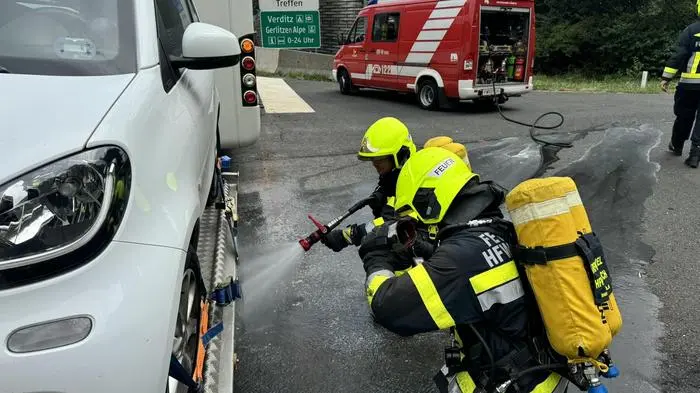 Heute, 20. August, gegen 13 Uhr wurden die Hauptfeuerwache Villach, FF Vassach und FF Töplitsch zu einem Einsatz auf der A10 Tauernautobahn in Fahrtrichtung Villach alarmiert. Ein Reifen eines Autoanhängers, der mit einem Klein-PKW beladen und von einem Wohnmobil gezogen wurde, geriet 600 Meter vor dem Ende des Oswaldibertunnels aufgrund eines Reifenplatzers in Brand. „Der Fahrer des Gespanns, ein Feuerwehrmann, zeigte in dieser Situation Ruhe und Geschick: Er konnte das Gespann rechtzeitig aus dem Tunnel manövrieren und mit einem Feuerlöscher den Brand eindämmen, noch bevor die Einsatzkräfte eintrafen“, heißt es seitens der Feuerwehr.