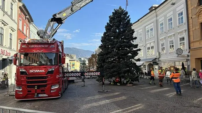Mit Polizei-Eskorte wurde am Mittwoch, 30. Oktober, eine 16 Meter hohe Silberfichte durch einen Tieflader von einem privaten Garten in St. Magdalen auf den Hauptplatz gebracht. Die Mitarbeiterinnen und Mitarbeiter der Abteilung Stadtgrün stellten den Baum professionell auf. In den kommenden Tagen wird die Silberfichte noch mit Lichterketten geschmückt. Der für den Garten zu groß gewordene Baum wurde gespendet und hat nun als Christbaum in der Innenstadt noch einmal einen großen Auftritt.