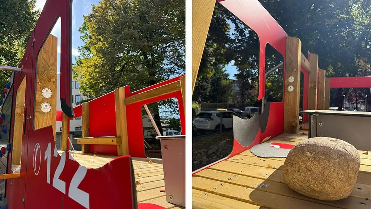 • Ein Feuerwehr-Auto auf einem neuen Spielplatz wurde mutwillig zerstört.