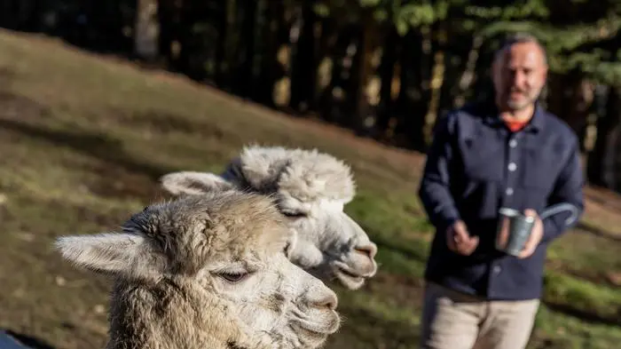 Ein Mann steht neben Alpakas und will sie füttern | Lerneffekt in der Natur: die Tiere geben das Tempo vor, der Mensch soll sich voll und ganz darauf einlassen