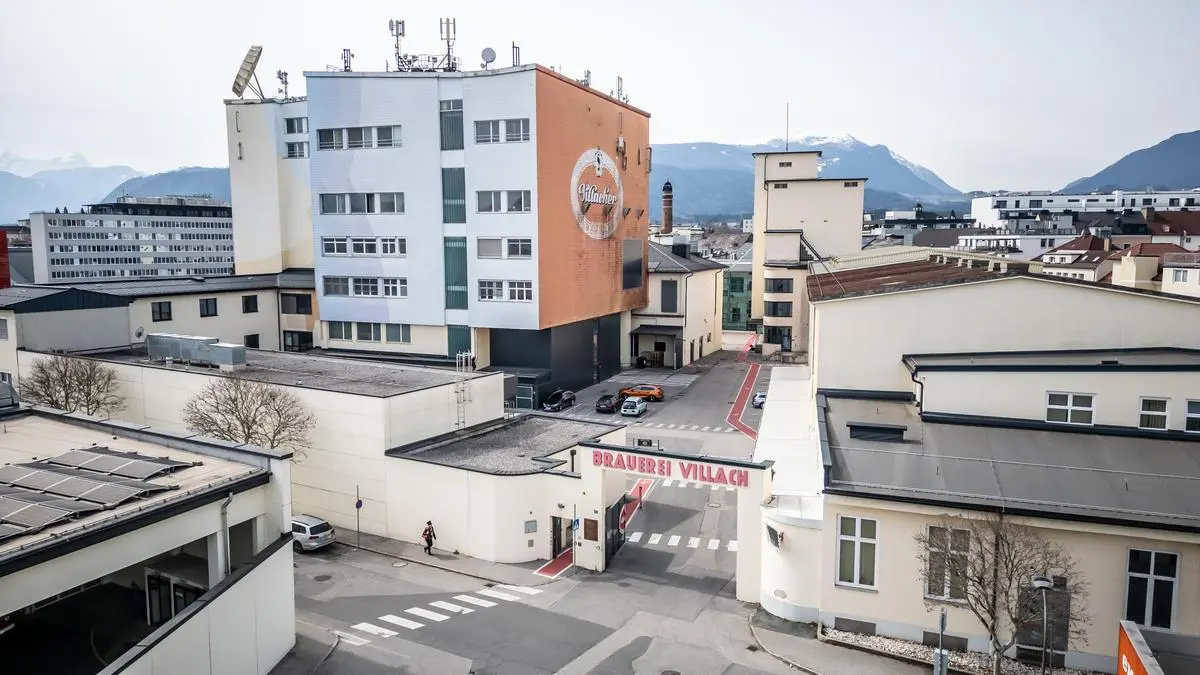 Das Villacher Bier Gelände von oben, mit dem roten Logo auf der Seitenwand des Hauses | Bis Frühjahr 2026 soll die Stadtbrauerei fertiggestellt sein, bis dorthin wird der neue Markenauftritt ausgerollt sein