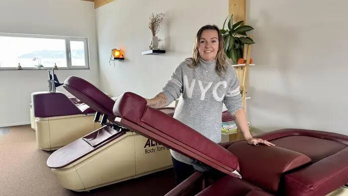 Eine Frau im grauen Pullover steht in einem Studio hinter einem roten Stuhl, dahinter befinden sich noch zwei Liegestühle | Die Gegendtalerin Michaela Harder zog Ende Jänner in die neuen Räumlichkeiten