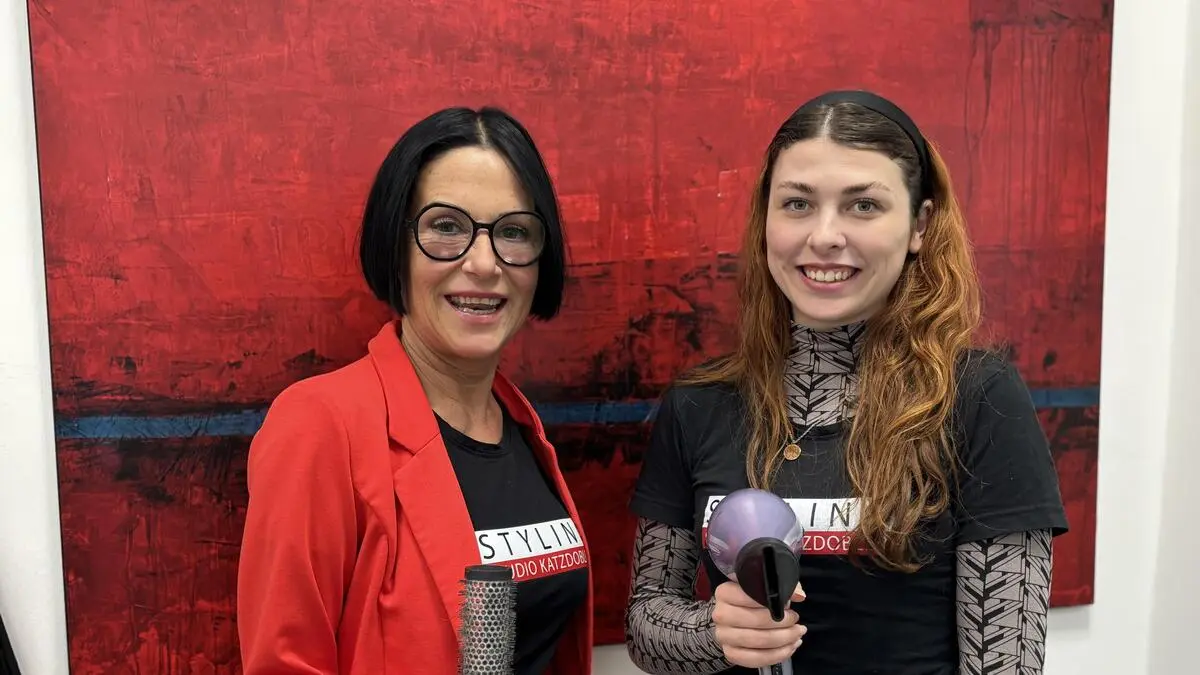 Zwei Frauen halten eine Bürste und einen Föhn in der Hand und stehen vor einem roten Bild | Unternehmerin Silvia Katzdobler (links) ermöglicht Jasmin Käfel Einblicke in die Arbeitspraxis