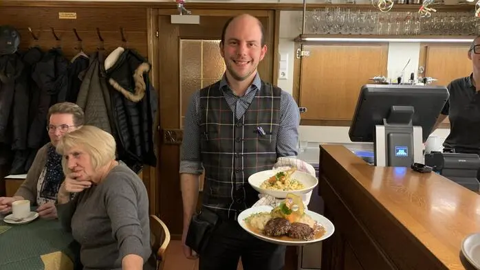 Ein Kellner in Gilet und Hemd trägt zwei Teller in einem Gastraum, links von ihm sieht man Menschen am Tisch sitzen, rechts sieht man die Theke