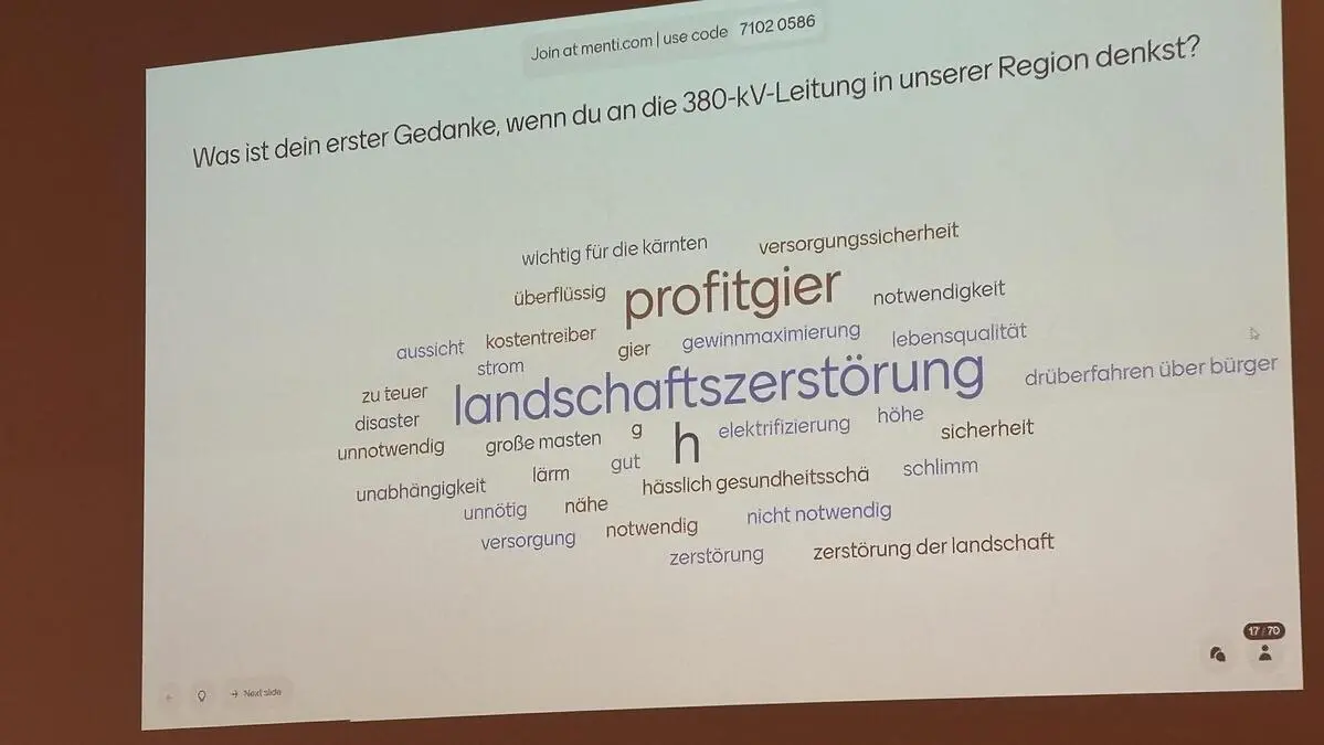 Eine Projektion auf eine Beamerwand, auf der Assoziationen zur 380-kV-Leitung oben stehen