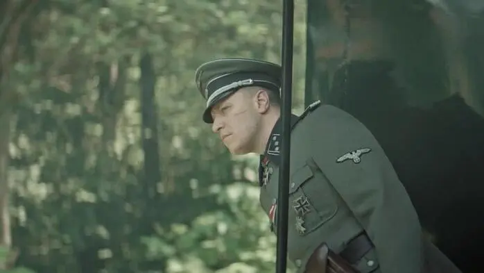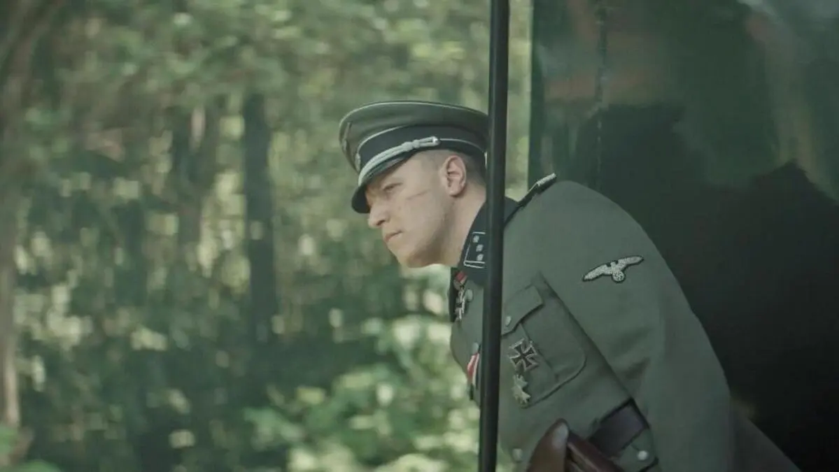 Ein Ausschnitt aus einem Film. Ein SS-Offizier schaut aus einem Zug