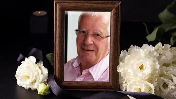 Gerahmtes Porträt eines grauhaarigen Mannes im Anzug mit Fliege, davor Kerzen und Blumen