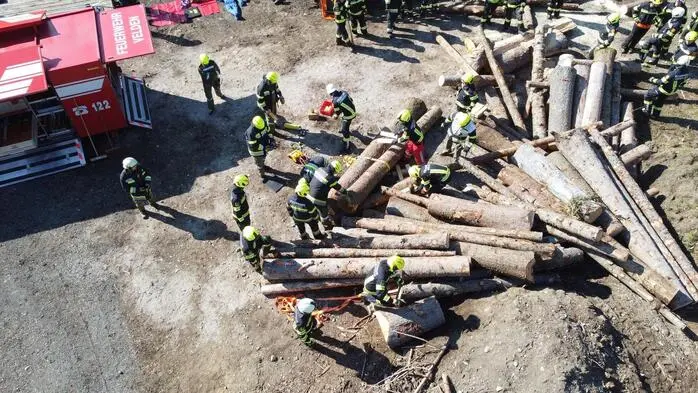 Vogelperspektive auf mehrere Holzstämme, rundherum sieht man Feuerwehrmänner