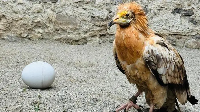 Ein Ei aus dem 3D-Drucker sorgt in der Adlerarena auf der Burg Landskron für Aufsehen: Schmutzgeier „Lenny“ trainiert damit eine raffinierte Technik, um an Nahrung zu gelangen.