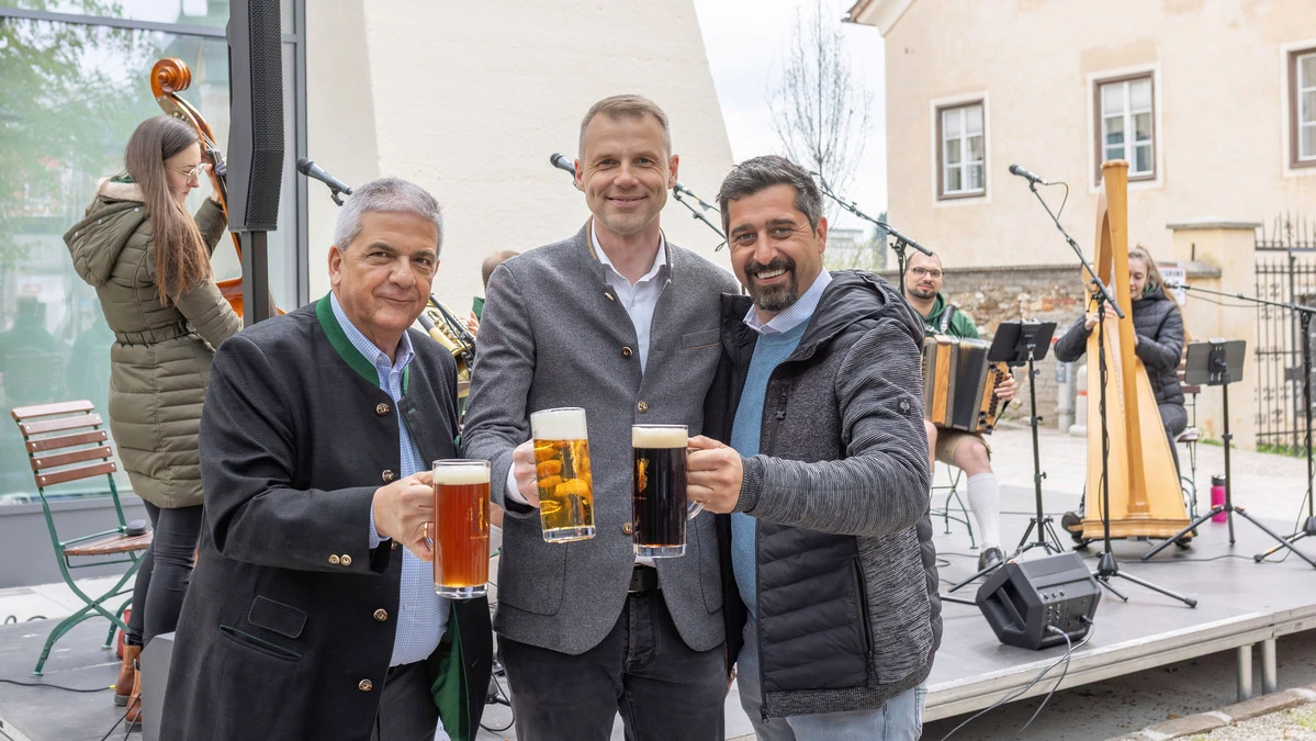 Jubilar Leitner, Wirt Huditz jun., Bier-Manager Plieschnig (von links)